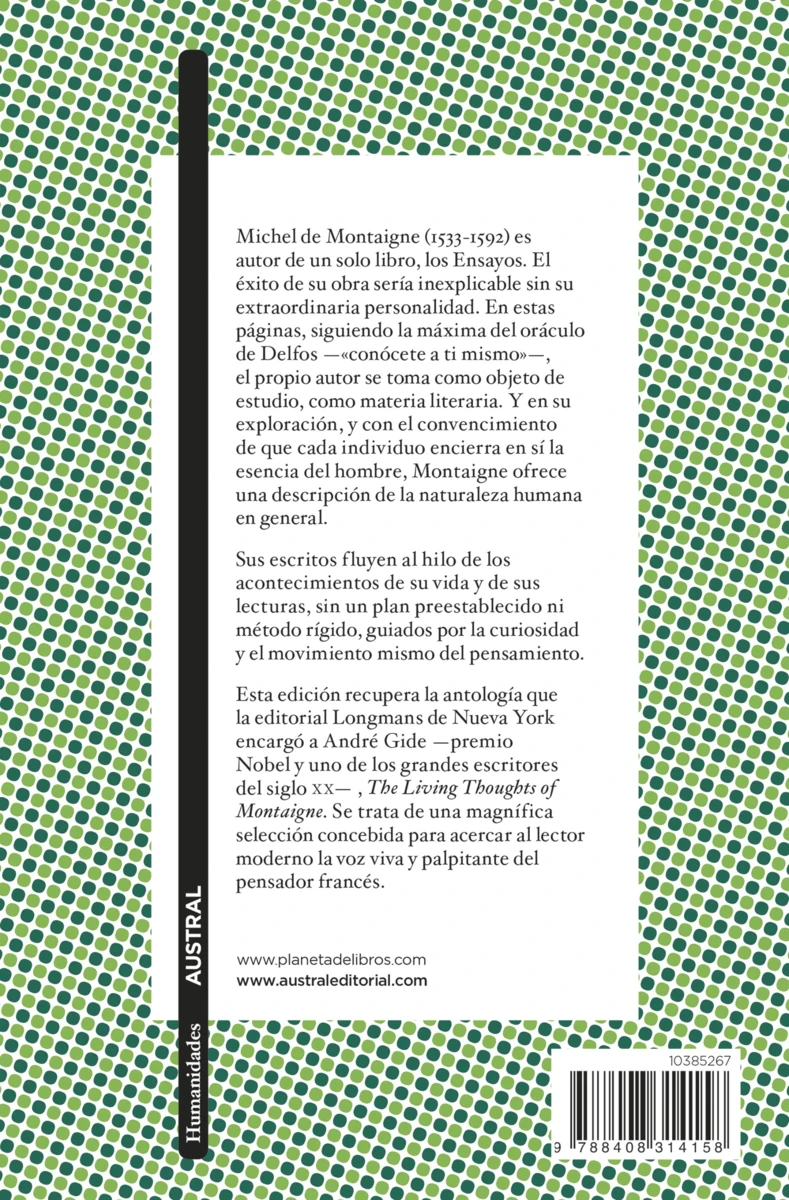 Una antología esencial que reúne los pasajes más reveladores de los Ensayos de Montaigne, acompañados por el comentario inteligente y sensible de André Gide.