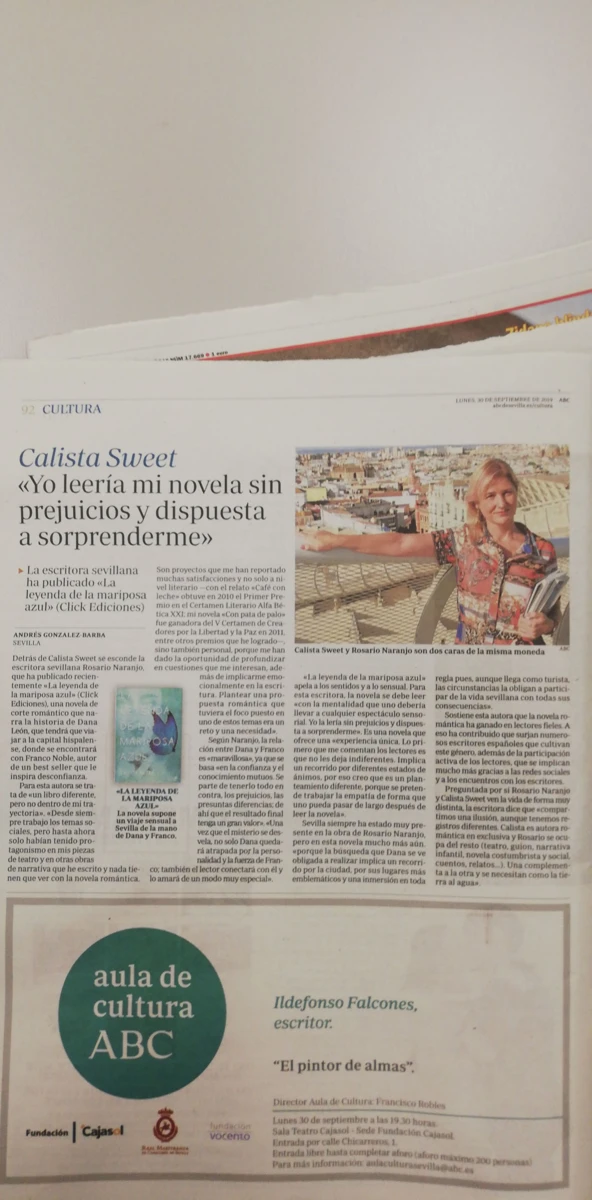 Licenciada en Derecho, DEA en Literatura y Comunicación, a Calista Sweet le apasionan las novelas donde los sentimientos cobran un especial protagonismo y constantemente se debate entre leerlas o escribirlas. Desde 2008, fecha en la que se proclama ganadora del Primer Premio de Novela sobre el barrio de Triana, compatibiliza su carrera de escritora con su trabajo en el MAETD y la redacción y corrección de textos.