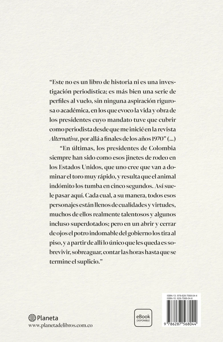 Roberto Pombo es quizás el analista político mejor informado del país. Él que más se ha acercado a las intimidades del poder en Colombia. En este libro, el periodista utiliza ese conocimiento privilegiado para dirigirse a los expresidentes de Colombia mediante cartas personales. Esto dice de dos de ellos: