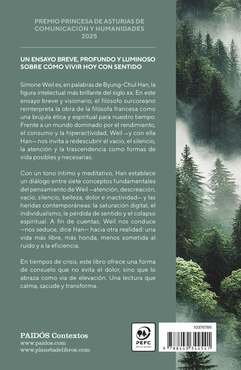 De la mano Byung-Chul Han, el filósofo contemporáneo más leído y Premio Princesa de Asturias de Comunicación y Humanidades 2025, nos llega una reflexión brillante y serena en conversación con el pensamiento de Simone Weil sobre la necesidad de recuperar el sentido.